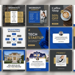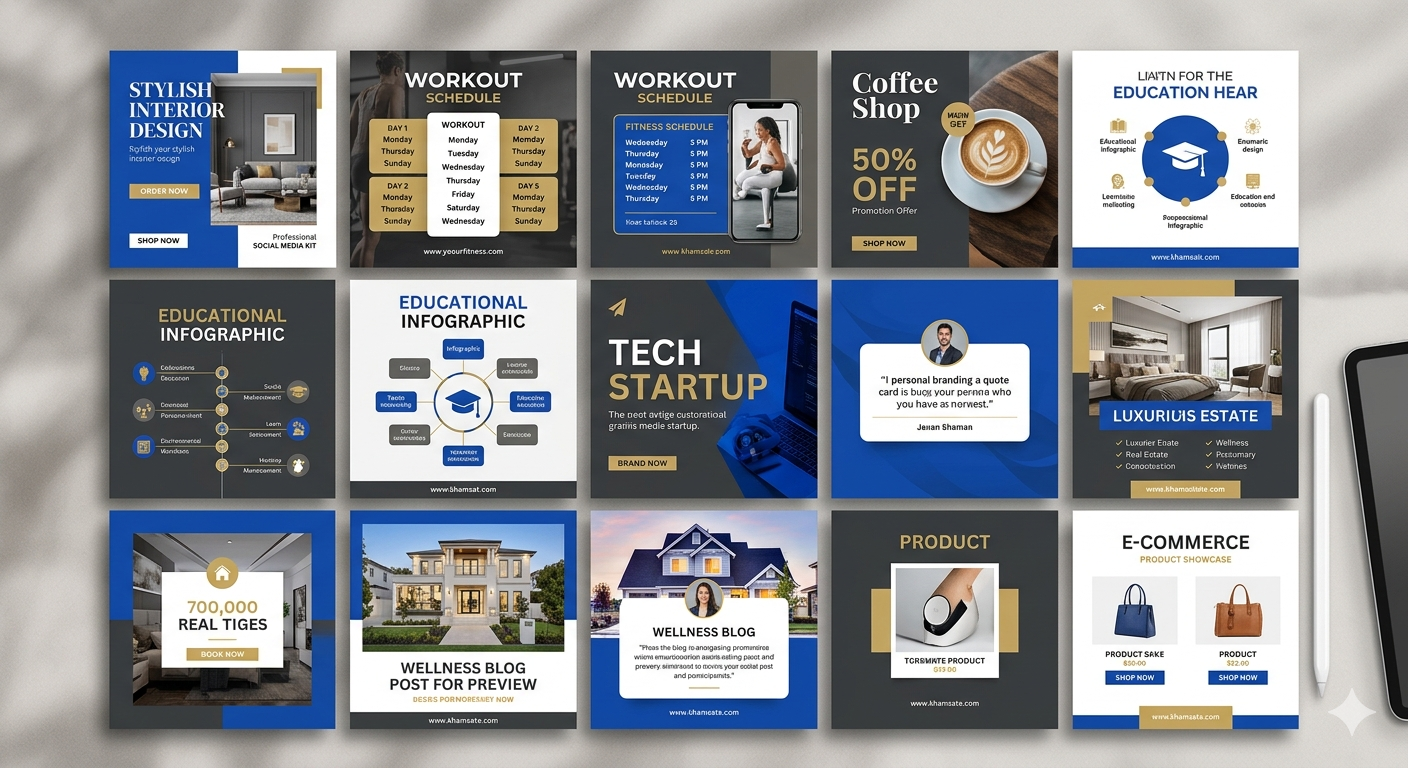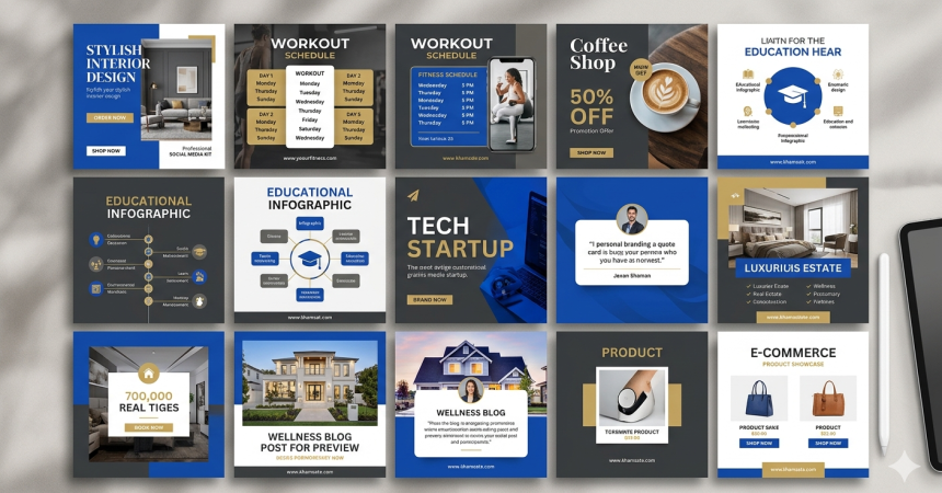 تنوع التصاميم: 50 قالب تشمل بوستات إعلانية، اقتباسات، ومحتوى تفاعلي.